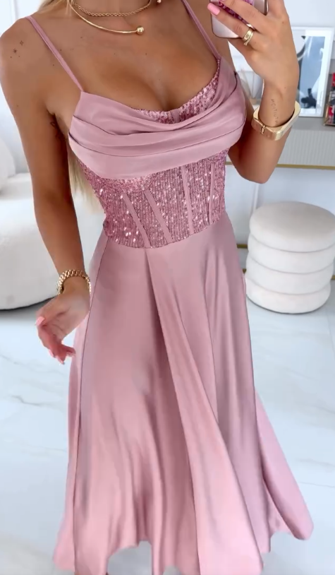 Ingenuity is evident in the meticulously arranged sequins, the backless silhouette fits the neckline, and the hem drapes naturally. It cleverly blends romantic sexiness with comfort and practicality, each detail imbued with stylish sophistication.