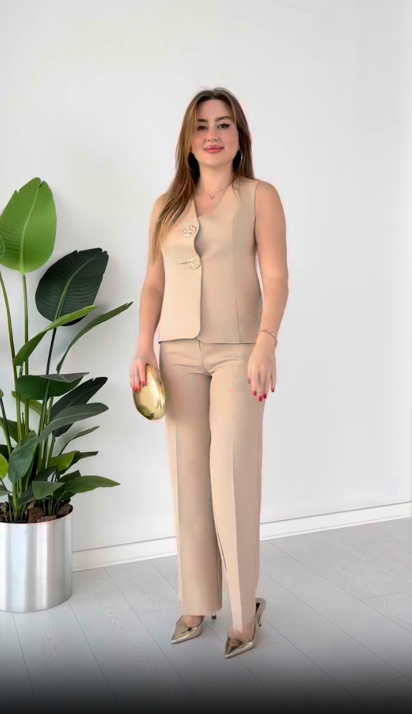 This 2025 summer new suit is simple yet stylish. The V-neck vest, embellished with chic buttons, breaks the monotony and frames the neck elegantly.