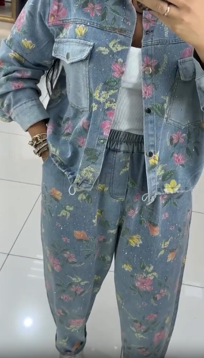The loose-fitting denim jacket paired with the matching printed trousers creates a relaxed and effortless look, creating a relaxed and effortless feel. The unique floral print adds a touch of fashion and romance to the overall look, making it an easy street style sensation.