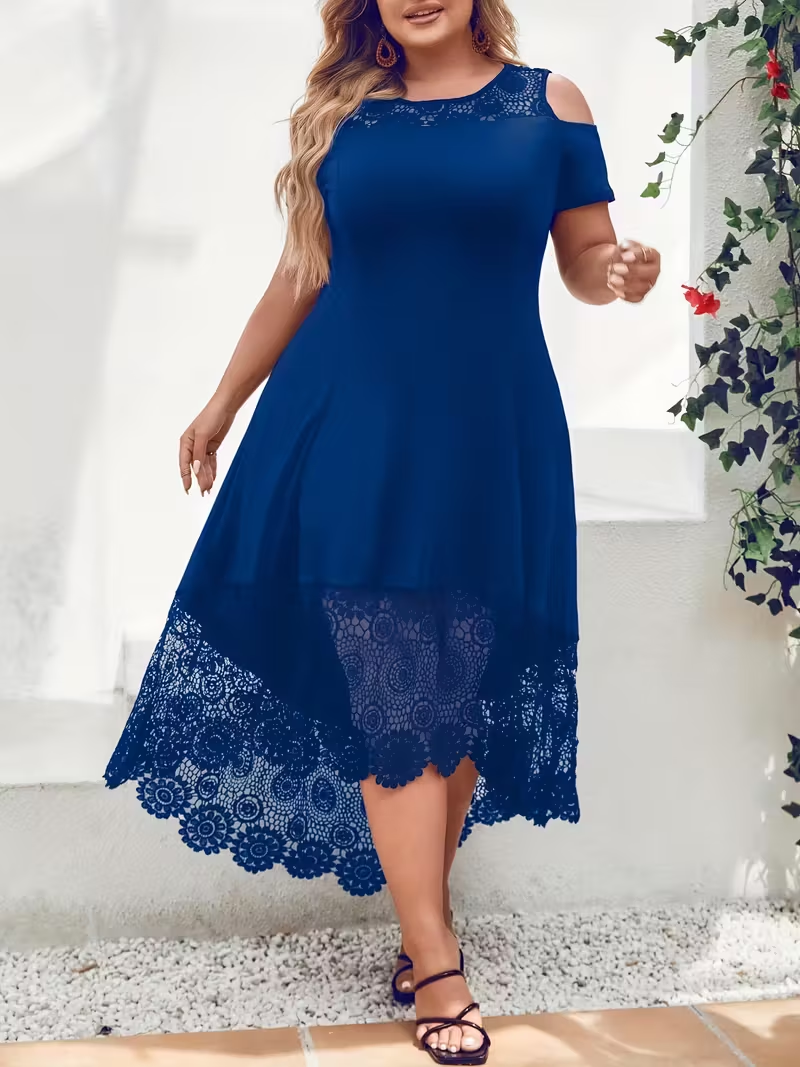 This dress features chic cold-shoulder sleeves, intricate lace detailing at the neckline and hem, and a flowing midi silhouette that flatters every figure. The soft fabric ensures comfort, while the stylish design makes it versatile for both casual outings and special events. Whether you’re heading to a brunch, a dinner date, or a garden party, this dress is designed to make you feel confident and chic.