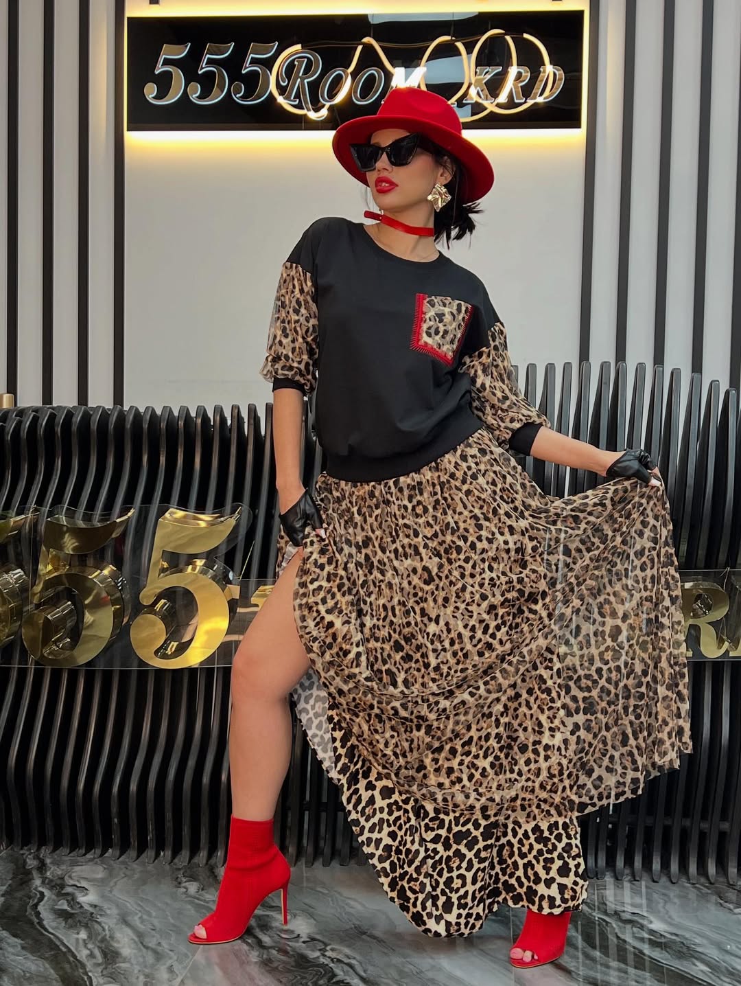 This leopard print maxi two-piece perfectly blends wild allure with sophisticated elegance. Crafted from high-quality, flowing fabrics, paired with a sophisticated leopard print, it creates a slimming yet elegant look.