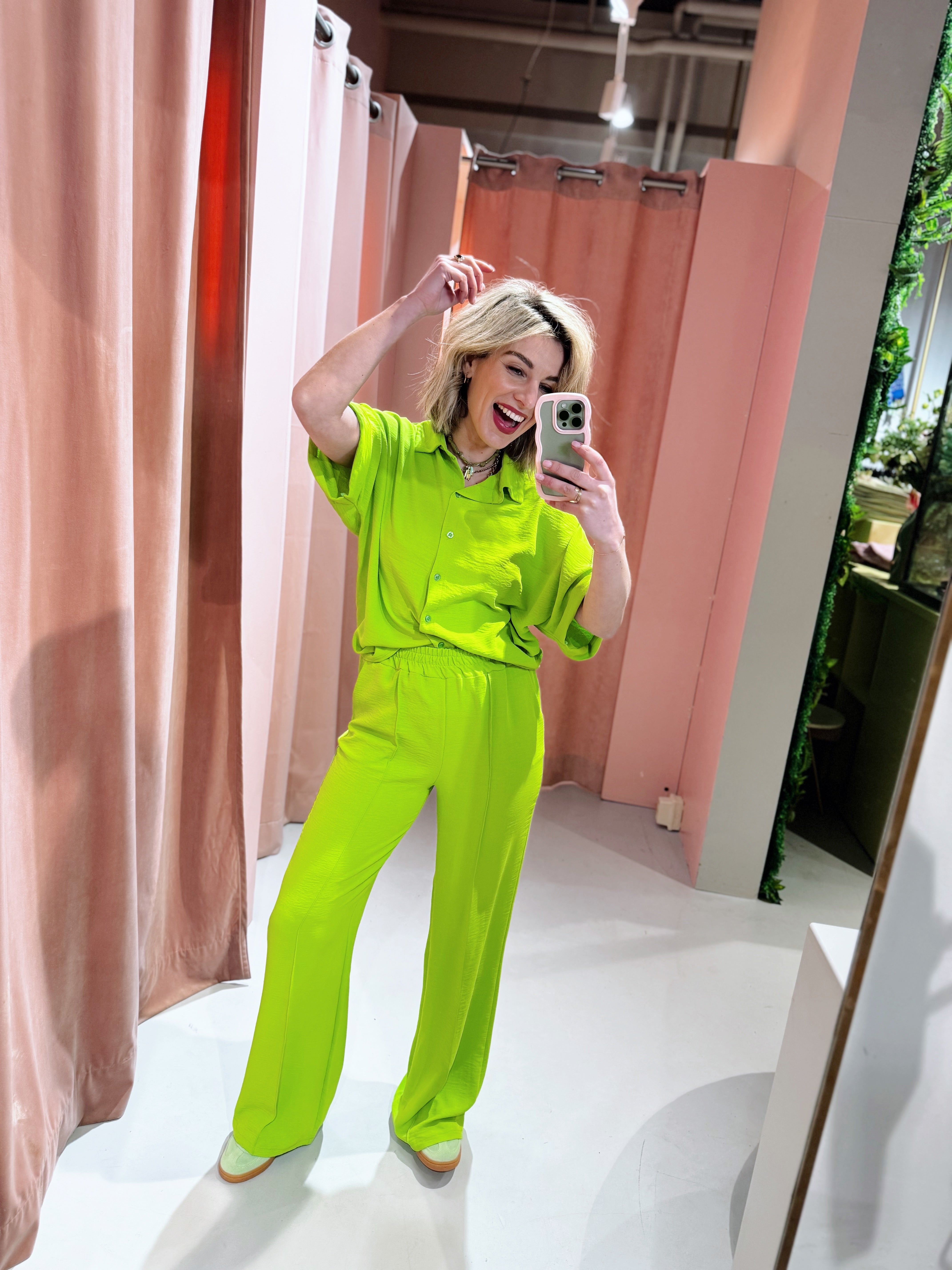 Want to make a statement? This lime green does just that! The vibrant color and flowy viscose fabric make this a real eye-catcher. The loose blouse and wide pants together create a playful, nonchalant vibe. Wear it casual with slippers or go for a striking look with heels.