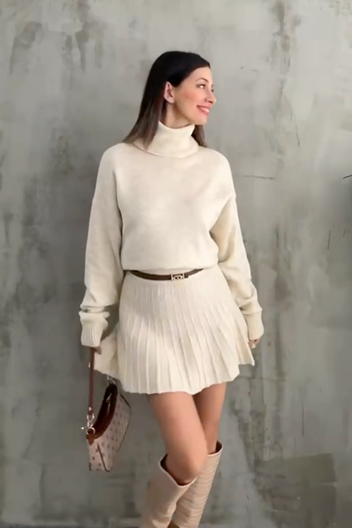 The turtleneck sweater envelops you with warmth and refinement, while the pleated knit skirt creates fluid, feminine movement with every step. The high waist flatters the figure and allows you to easily combine it with a belt to emphasize the waist.