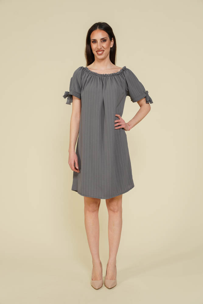 Striped dress with a tie on the sleeves. In front he makes a large round neckline with rubber that makes like little whistles. Its sleeves are close and at the end make a very beautiful tie. The entire dress is in an alpha line and its length reaches about up to a little above the knee. It drops a lot of gas and does not stick to the body. There's no other detail on the back.