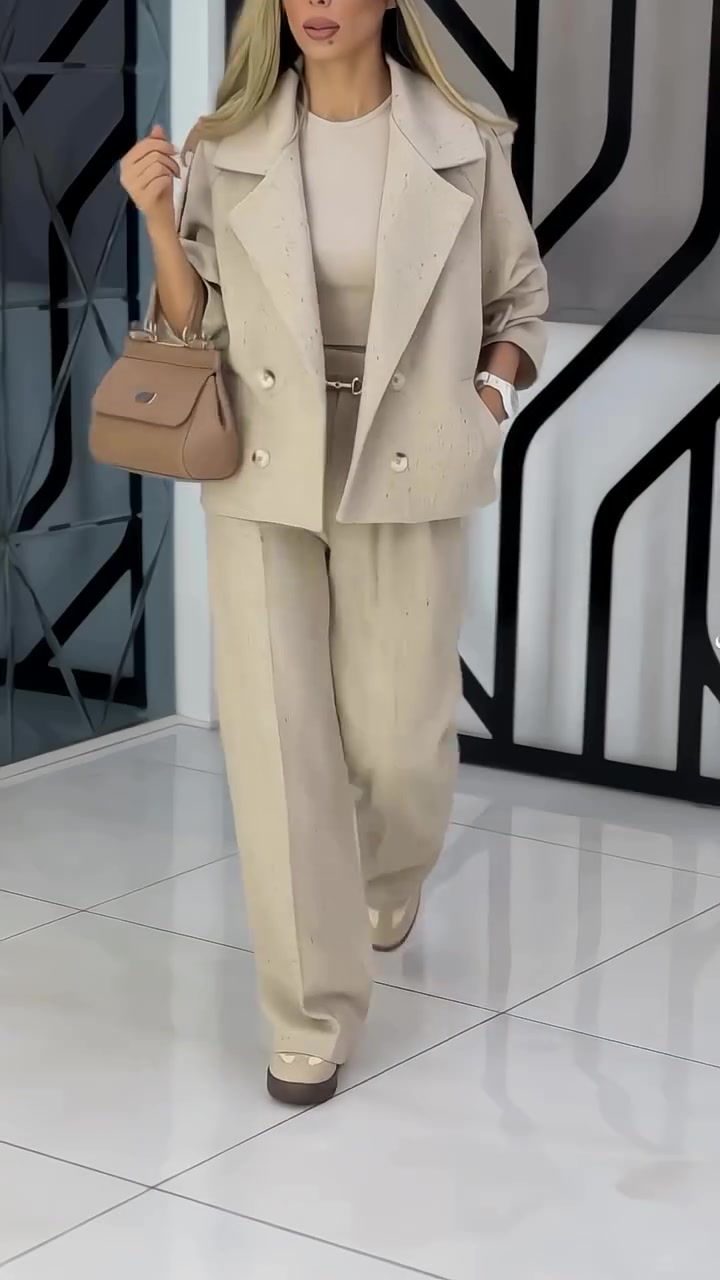 This stylish ensemble, featuring a lapel blazer and high-waisted wide-leg pants, exudes elegance and sophistication. The lapel blazer boasts a classic silhouette with sleek lines, while the lapel adds a sharp edge and flatters the neckline.