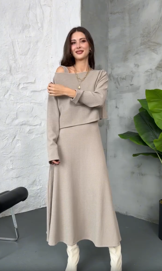 This off-the-shoulder knit suit boasts exquisite details and ingenious design, surpassing the average casual wear. The off-the-shoulder design is unique and eye-catching, while the overall look is simple yet elegant.