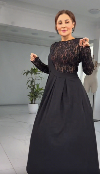 The long-sleeved lace design is versatile, providing sun protection and contouring to the arms. The high-waisted, full-length skirt flatters the hips and legs, enhancing the figure's elegance. The skirt sways naturally as you walk, adding a touch of movement.