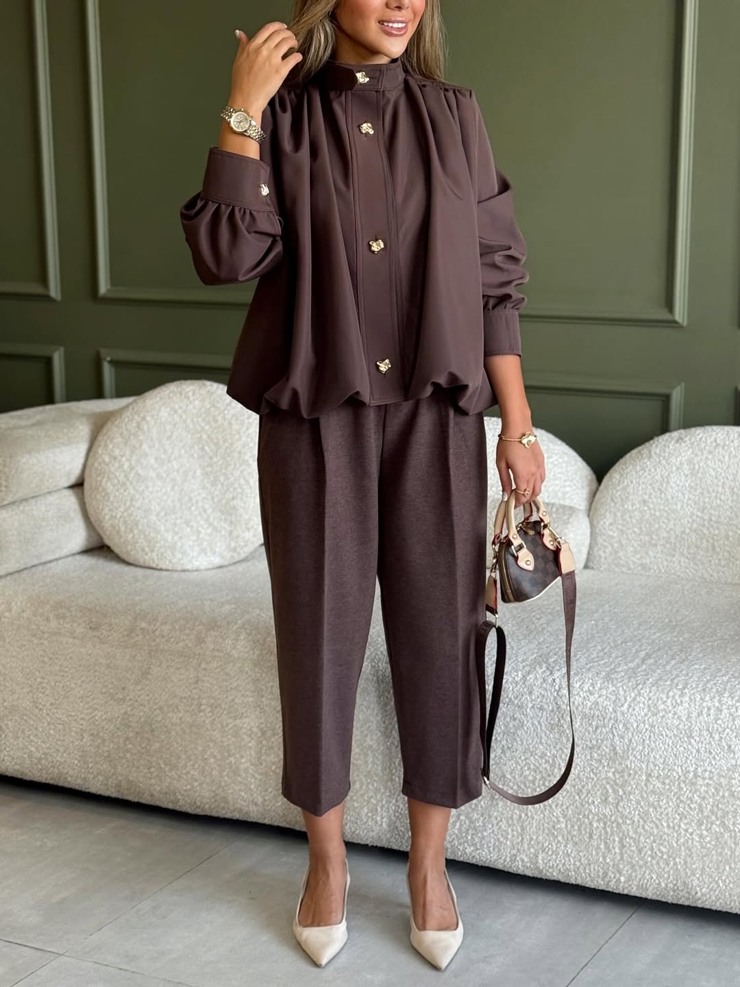 This suit set is a clever blend of competence and style. The simple design creates a relaxed and comfortable atmosphere, while exquisite accessories add a touch of fashion and sophistication, making you feel elegant when wearing it.