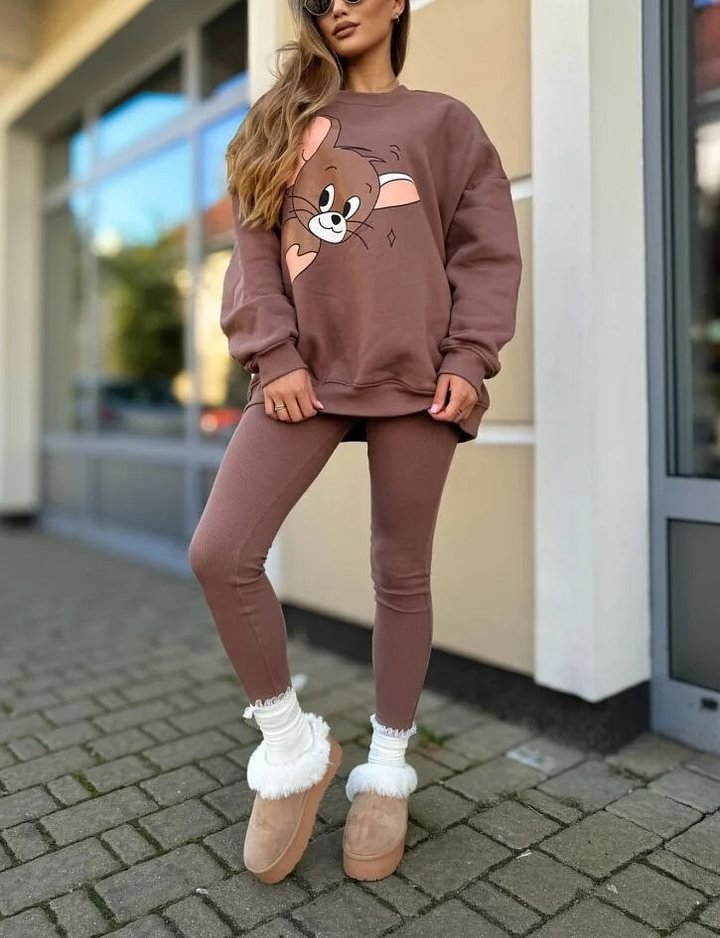 Cotton sportswear set with leggings  is for women who value the combination of sophistication and unique style. The long-cut sweatshirt with low sleeves and seams adds lightness to the silhouette. The print of Jerry, the character from the cult cartoon Tom and Jerry, is a unique accent that adds a touch of nonchalance and charm to the whole outfit. The high-waisted leggings perfectly shape the figure and highlight the advantages. The ribbed material is stretchy and soft, allowing the leggings to fit the body perfectly without restricting movement.