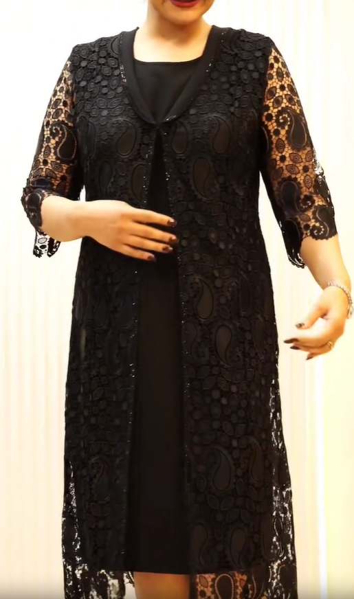 This V-neck, solid-color, hollow lace midi-length summer nylon outerwear features an exquisite lace design. The clever combination of lace and solid fabric creates an elegant and romantic visual effect.