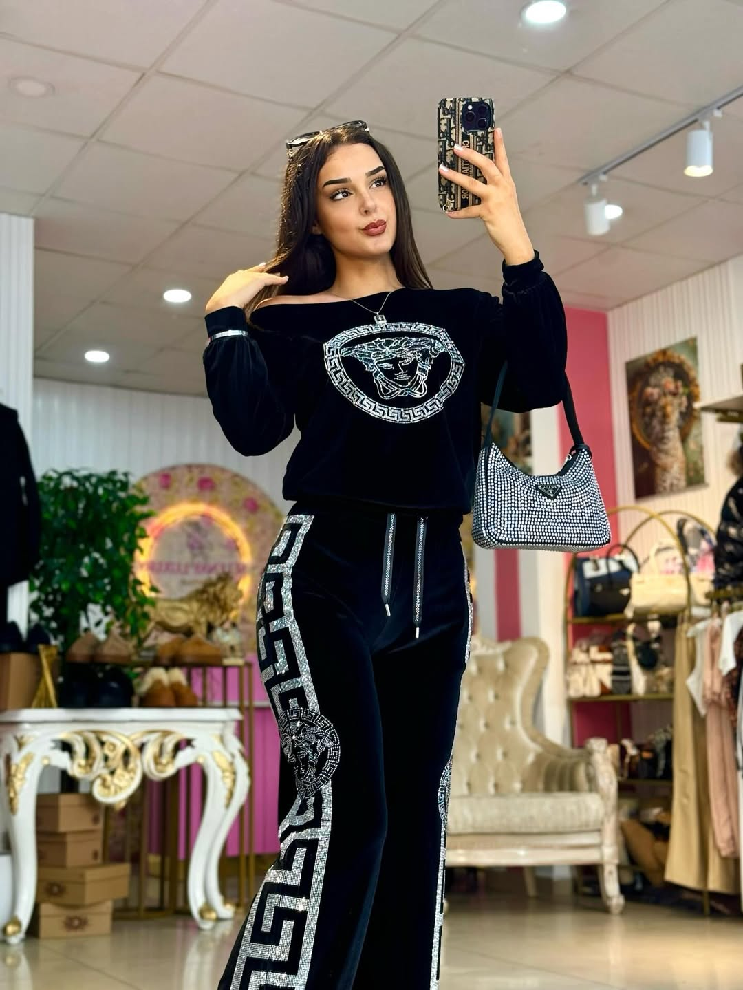 Hey luxury fashion lovers! Introducing our Velvet Embellished Loungewear Set—a bold fusion of opulent velvet, intricate crystal detailing, and iconic design, perfect for elevating your casual looks with high-fashion flair!
