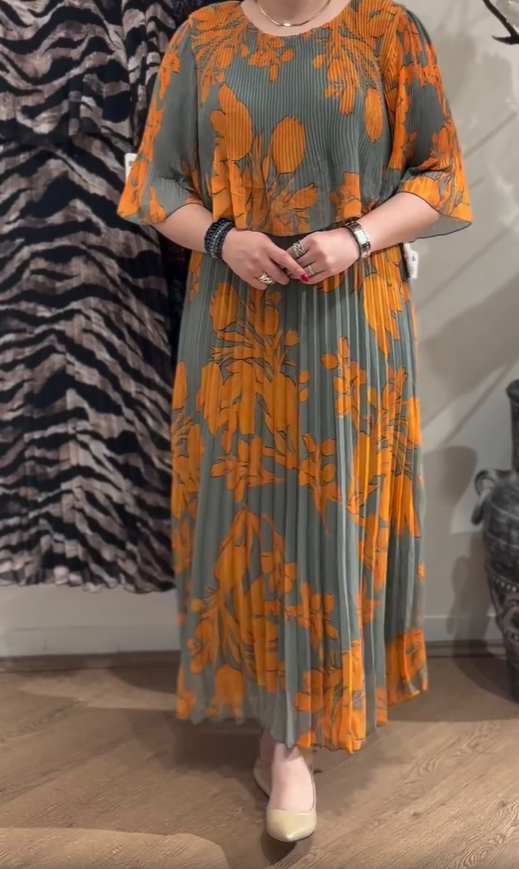 This casual and elegant pleated two-piece dress features a vibrant floral print, interweaving multi-colored floral patterns to create a vibrant and eye-catching effect. The short sleeves add a fresh and stylish touch while also flattering the arms.