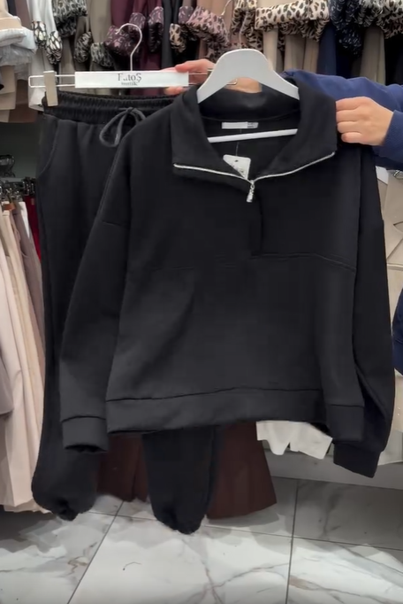 A half-zip design and minimalist silhouette combine to create a casual suit, creating a sophisticated yet refined look that transcends ordinary casual wear. The half-zipper element of the suit is sharp and eye-catching, creating a simple yet stylish look.