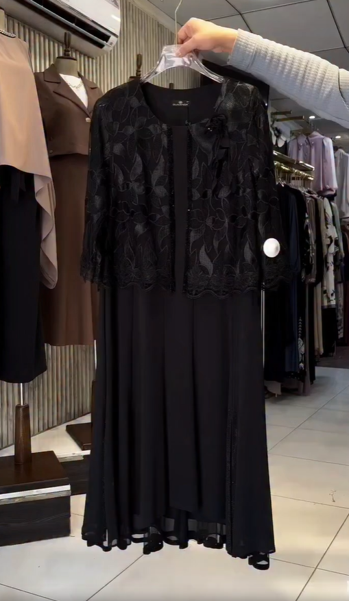 This stylish long-sleeved dress set features delicate lace panels, featuring a black lace jacket paired with a matching skirt.