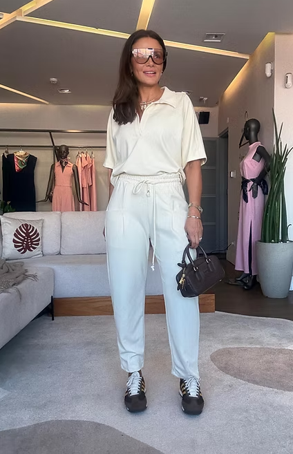 The soft, skin-friendly fabric is breathable and comfortable, eliminating sweat. The loose fit of the top and the cuffed pants provide ample room for movement, ensuring comfort and a light feel even during long shopping trips or workouts.