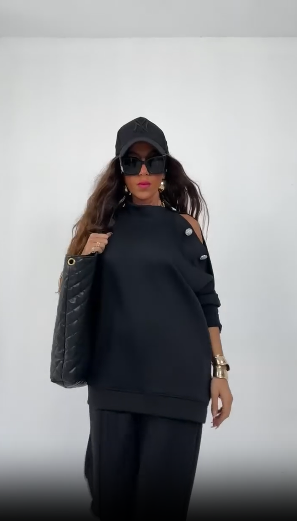 This stylish women's suit cleverly blends elegance and style. The high-necked, buttoned, off-the-shoulder top features a unique design. The high collar adds a sophisticated touch, providing warmth and a stylish look.