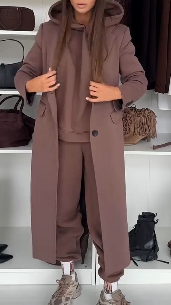 • Chic Design: Features a matching hoodie and joggers set, topped with a tailored long trench coat, all in a refined neutral hue. The relaxed loungewear silhouette pairs seamlessly with the structured coat, creating a balanced blend of comfort and sophistication, perfect for transitional styling.