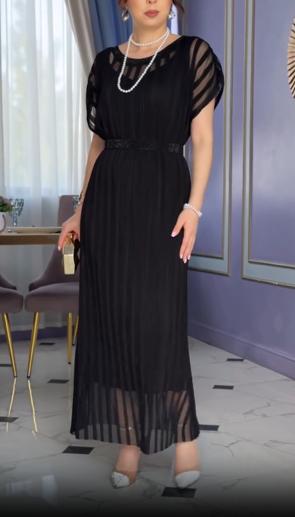 This women's dress cleverly blends elegance and style. The simple, round neckline fits snugly around the neck, evoking a gentle presence. The short sleeves are paneled with semi-transparent mesh, revealing a subtle glimpse of skin and adding a touch of sexiness and movement.