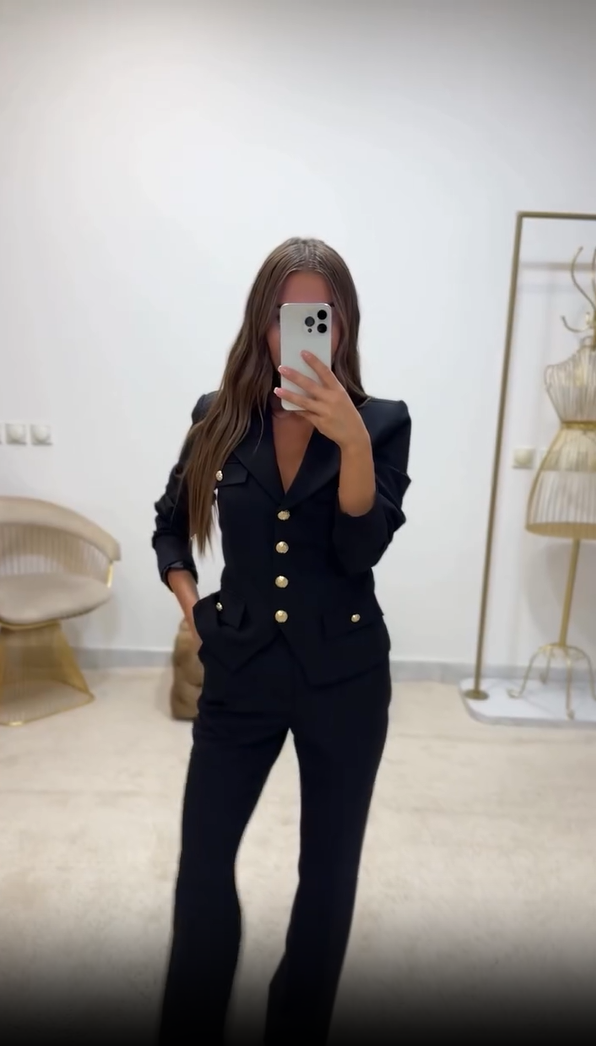 This stylish, sophisticated women's suit with metal-buttoned straight-leg trousers exudes the confidence and charm of a professional woman. The blazer is meticulously tailored, with a classic lapel design that flatters the shoulders and creates a refined and elegant look.