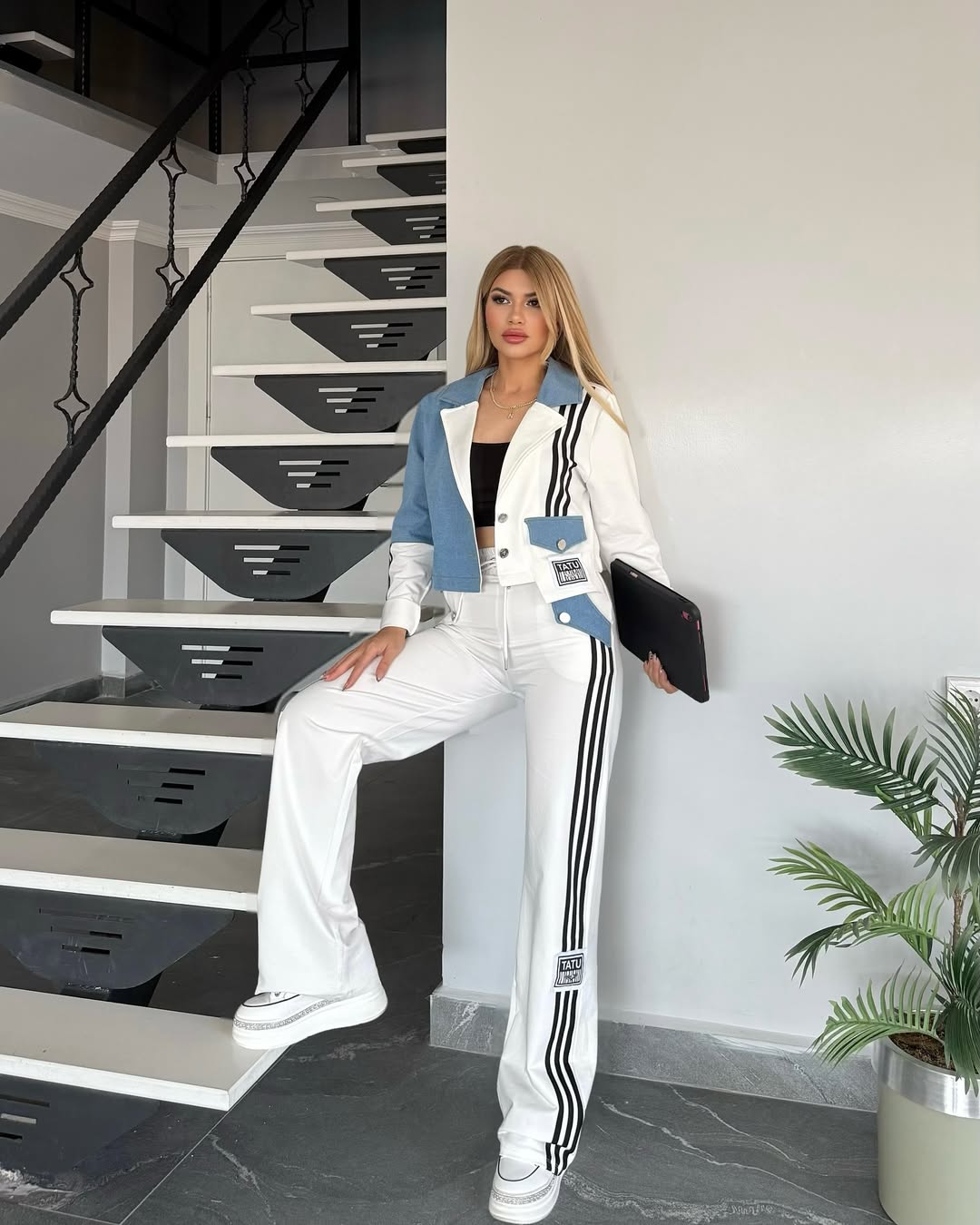 This stylish women's suit perfectly blends individuality and style. The short jacket features a patchwork design, creating a unique visual dimension and a stylish aesthetic that breaks the monotony.
