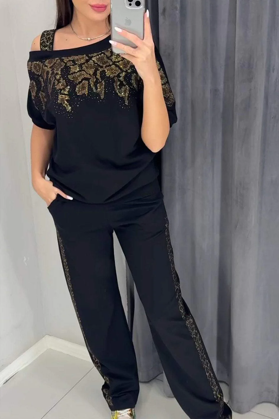 Ingenuity is evident in the details: the off-the-shoulder silhouette fits the neckline, the rhinestone pattern is subtle and vibrant, and the side stripes on the trousers echo the design of the top. This clever fusion of sophisticated sexiness and comfort creates a stylish and practical look, each detail imbued with subtle subtleties.
