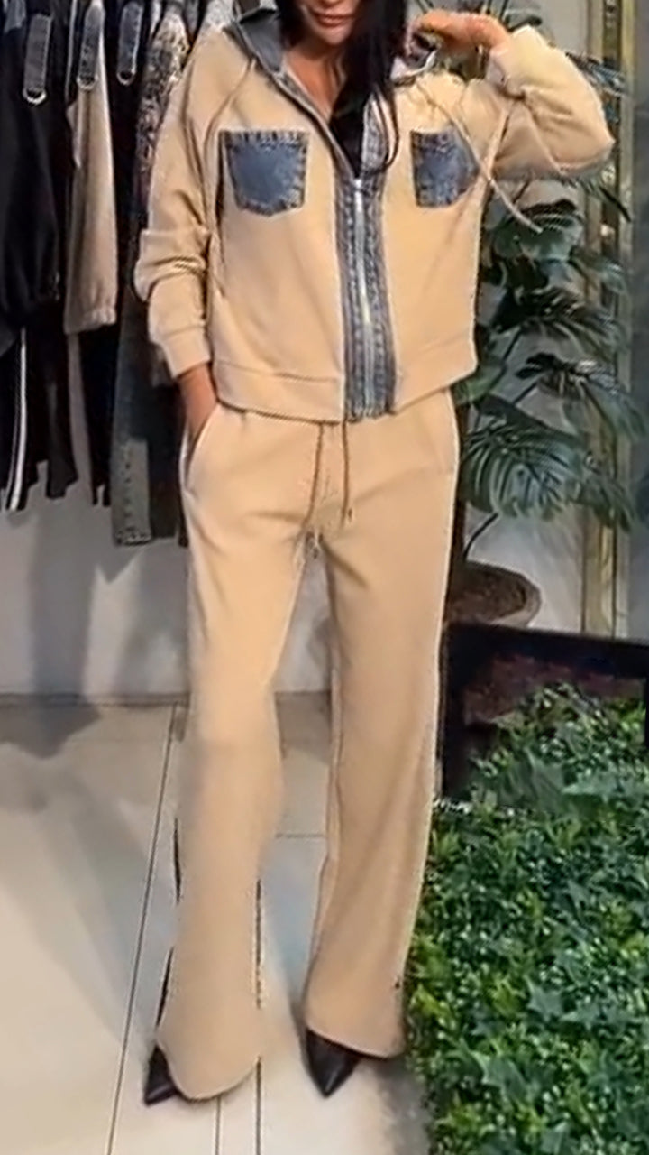 Womens Round Neck Hooded Spliced Zipper Coat + Pants Casual Suit
