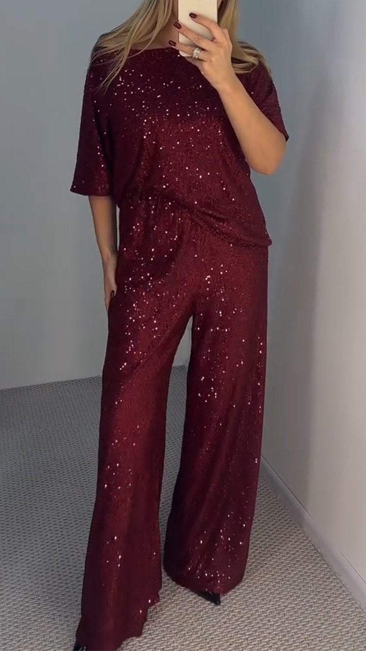 Women's Sequined Mid-sleeve Top + Trousers Casual Suit