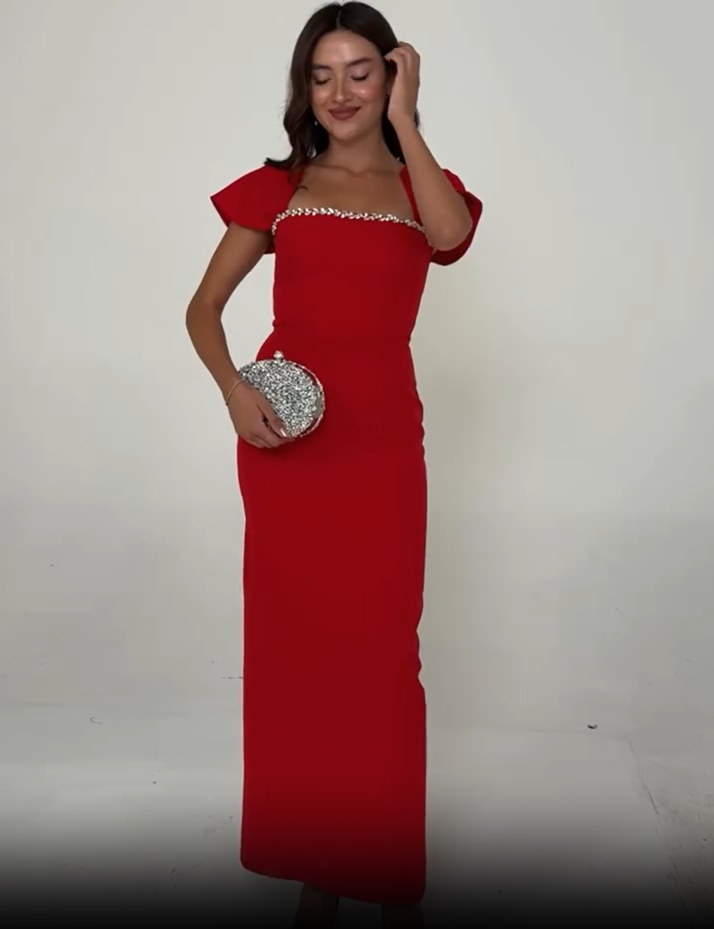 This women's maxi dress perfectly blends elegance and sophistication. The square neckline frames the neckline, adding a touch of elegance. The rhinestones cleverly accentuate the neckline, adding a touch of brilliance.
