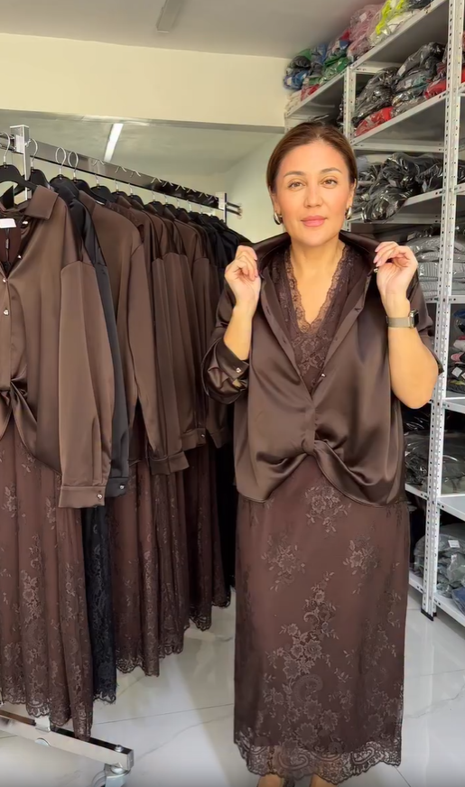 Women's V-neck fashionable lace dress + satin shirt
