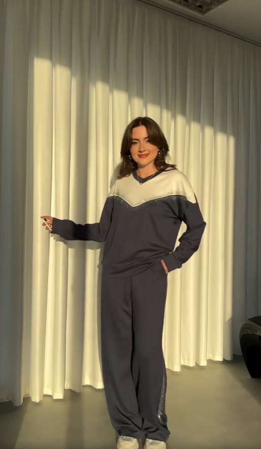 A unique color-blocked top paired with matching trousers. This clever pairing, with meticulous attention to detail, transcends ordinary casual wear.